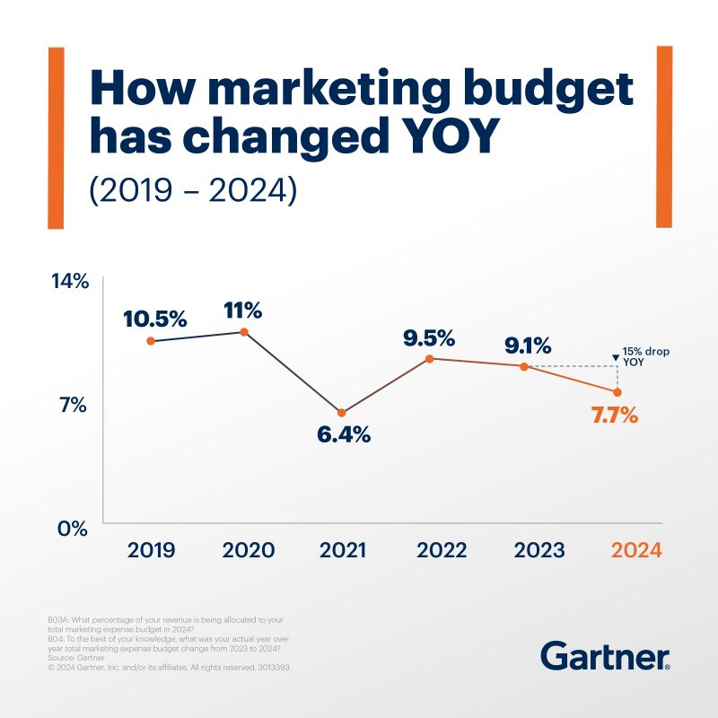 Resource Constraints: Marketing budgets as a percentage of total revenue decreased in 2024 to 7.7% (Gartner), driven by economic uncertainty and increased competition for corporate resources. This creates an expectation paradox where marketing teams must maintain or improve results while operating with reduced budgets and demonstrating clear ROI.